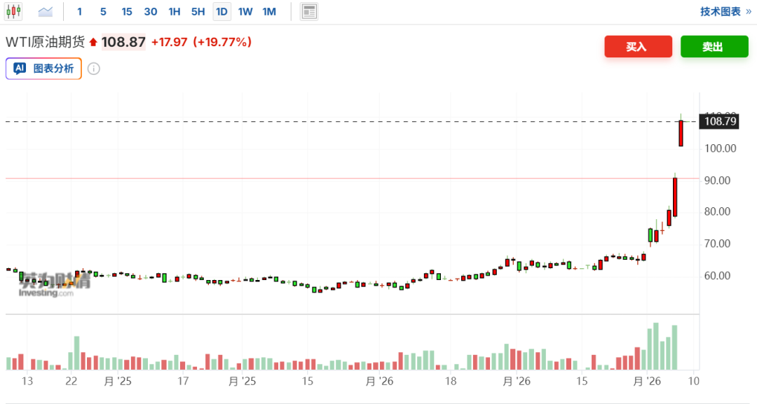 今早开盘,WTI原油期货一度向上触及110美元/桶,最新报108.87美元/桶,日内上涨22.11%。