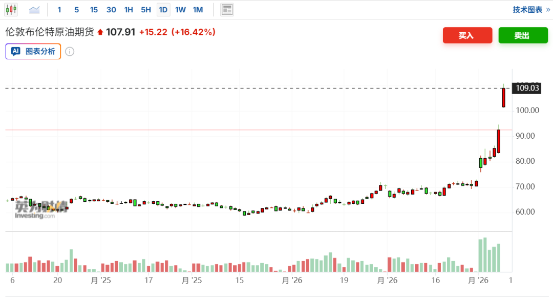 布伦特原油期货也曾触及110美元/桶,最新报107.91美元/桶,日内上涨18.96%。