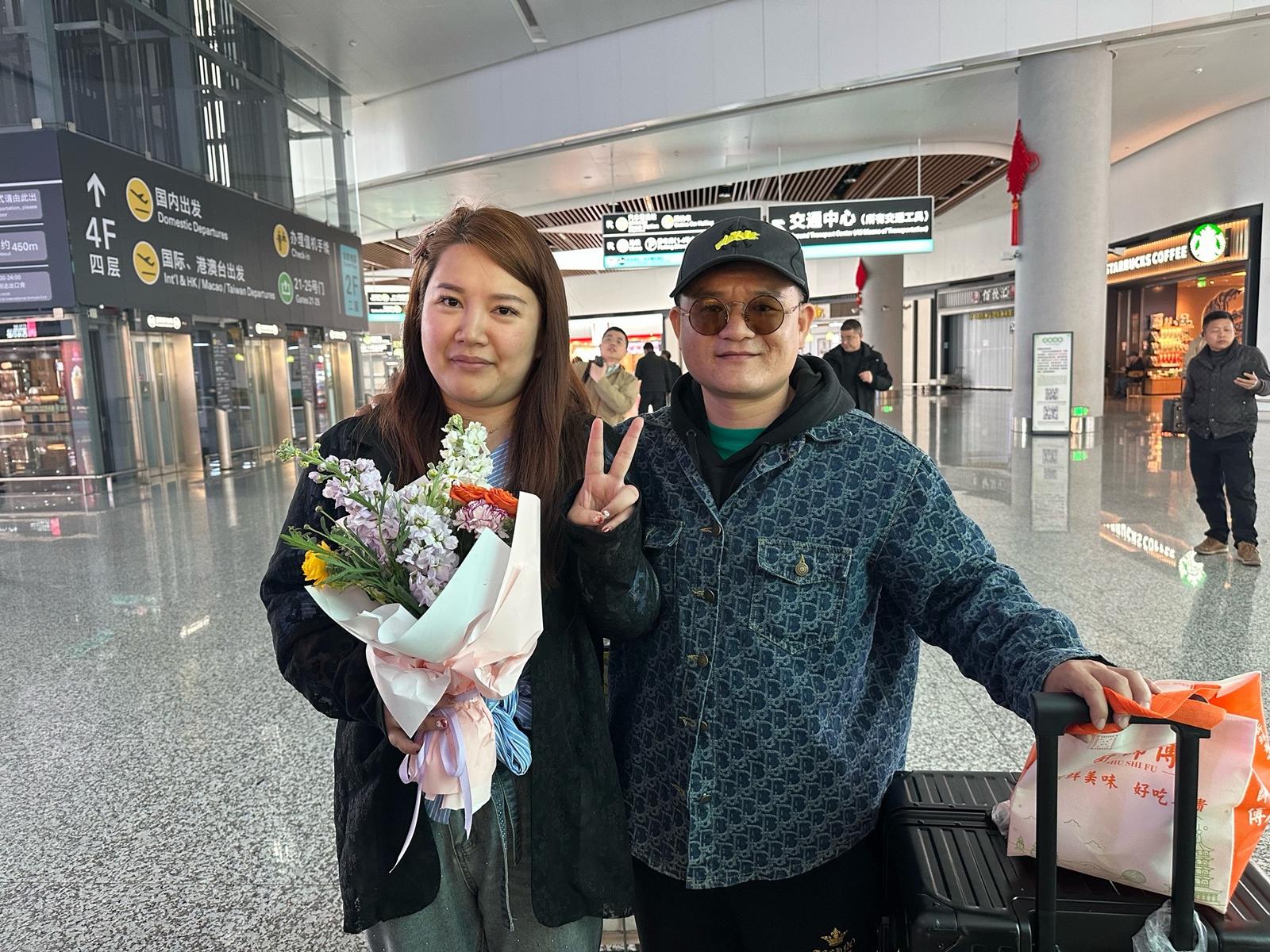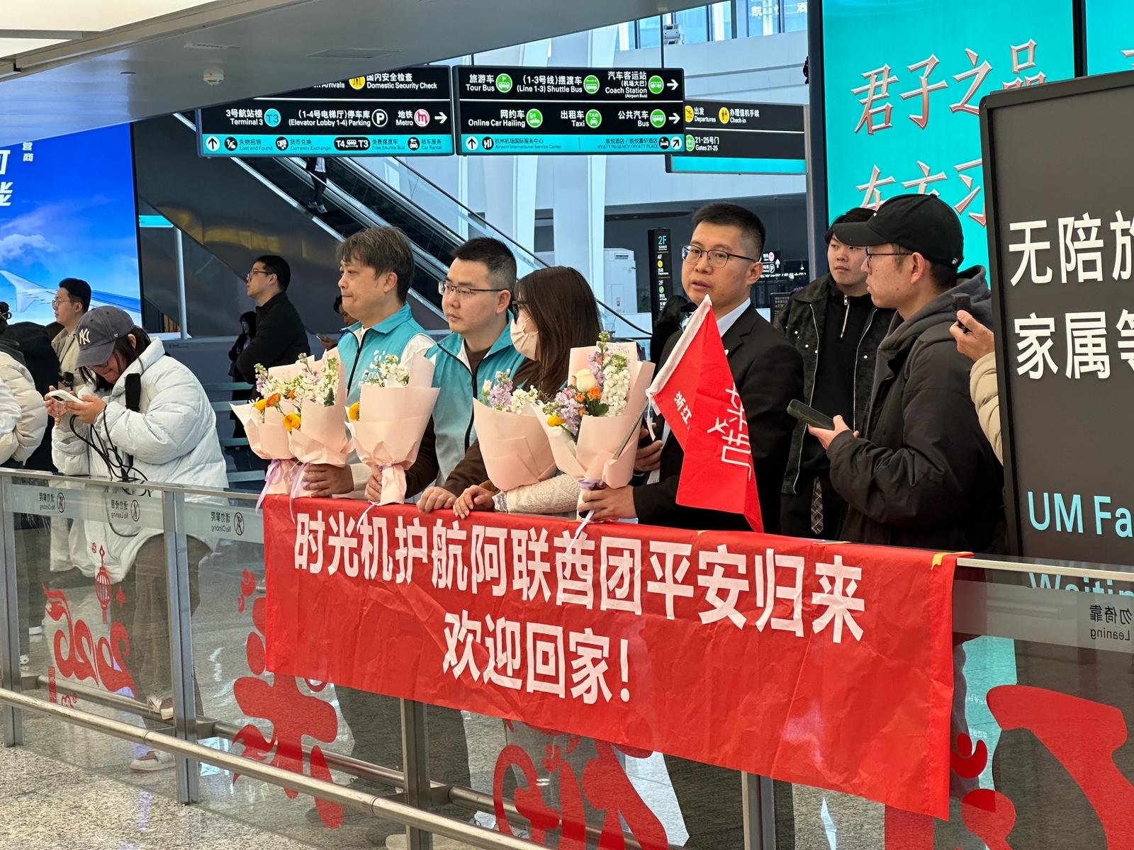 从事投资行业的杭州人陈辰,抵达航站楼到达大厅,看到一众人迎接他们的到来时,眼角不禁泛起了红色。
