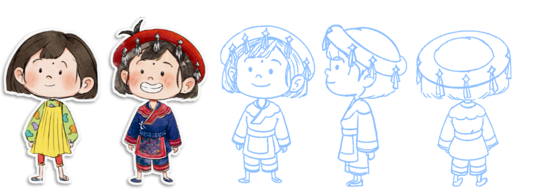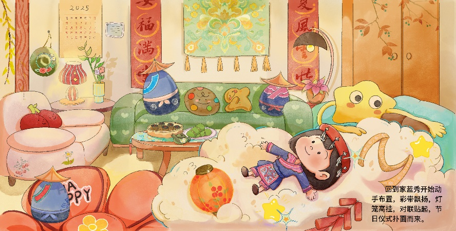 为了打破传统绘本的静态边界,创作团队将手绘艺术与前沿数字技术深度融合。他们先用Procreate软件进行手绘,严格遵循畲族传统美学,以青、蓝、红、白四色为基调:淡墨绿诠释畲乡山林,靛染蓝彰显民族工艺,朱红与明黄撞色烘托节庆氛围,水彩白勾勒山居生活。每一个角色的设计也颇具匠心,主人公蓝秀活泼好奇,易于引发年轻读者共鸣;而织彩带的阿婆、递茶的畲乡孩童等配角,其服饰与造型均经过严格考证,民族特色跃然屏上。