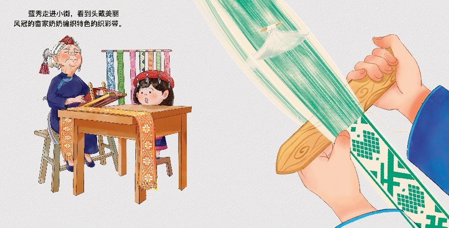 据悉,《未来畲谣》以6岁畲族女孩“蓝秀”的奇幻冒险为主线,串联起“发现畲族服饰—进入仪式感王国—体验畲族民俗—传承文化精神”的故事。绘本将畲族“三月三”传说、婚嫁对歌、彩带编织工艺、乌饭制作等民俗自然融入蓝秀的探索旅程,避免了枯燥的文化说教。读者在跟随主人公的脚步中,能感受到祭祖的庄重、对歌的欢快,领会团结友善、敬祖尊贤等畲族核心价值观,在欣赏画面的同时完成对民族文化的深度认知。