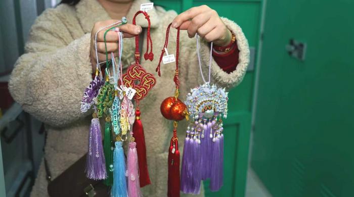 非遗绳结工艺制作人于丹丹,则把自己的仓库称为“小阵地”。推开仓门,葫芦、孔雀、中国结、花生造型的挂件堆得满满当当。