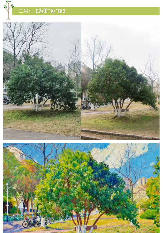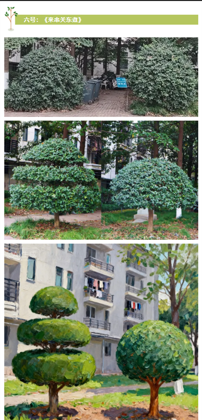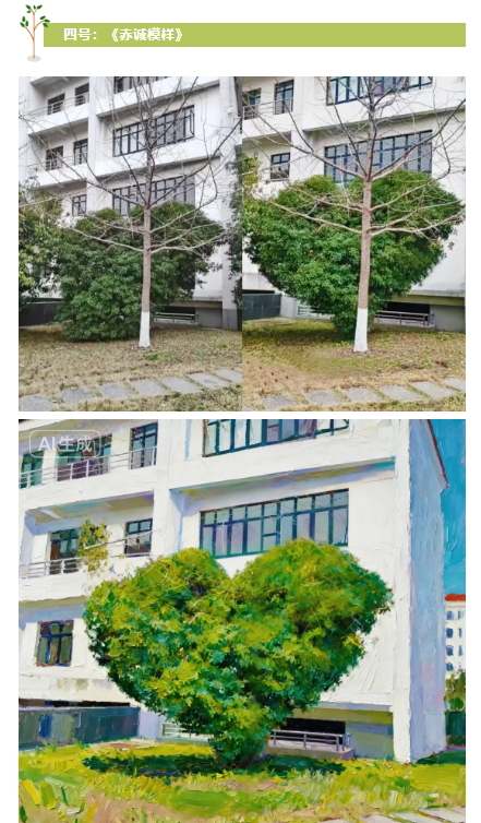 “除了线下修剪树木,我们还在微信公众号上同步发起‘校园最美修枝作品’投票,并邀请同学们投稿自己的AI修枝创意,鼓励大家从劳动实操者变成校园绿化的创意设计者。”该校后勤服务中心相关负责人介绍,“从以爱为营的心形模样到层次错落的‘关东煮’形象,同学们尽情挥洒创意,为校园的绿意增添青春的巧思。”