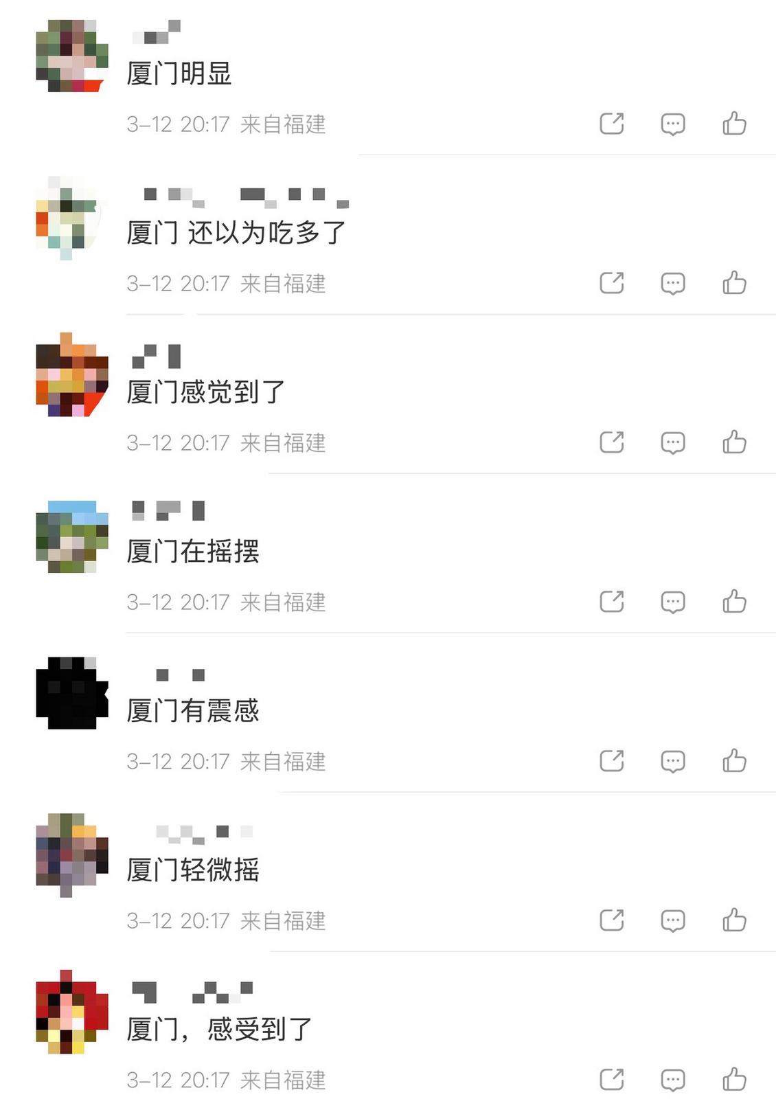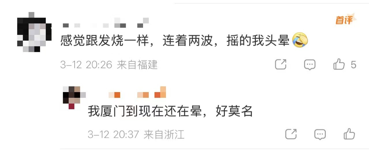 记者在网上看到,福建福州、厦门等地网友也表示震感明显,“连着两波,摇得我头晕。”