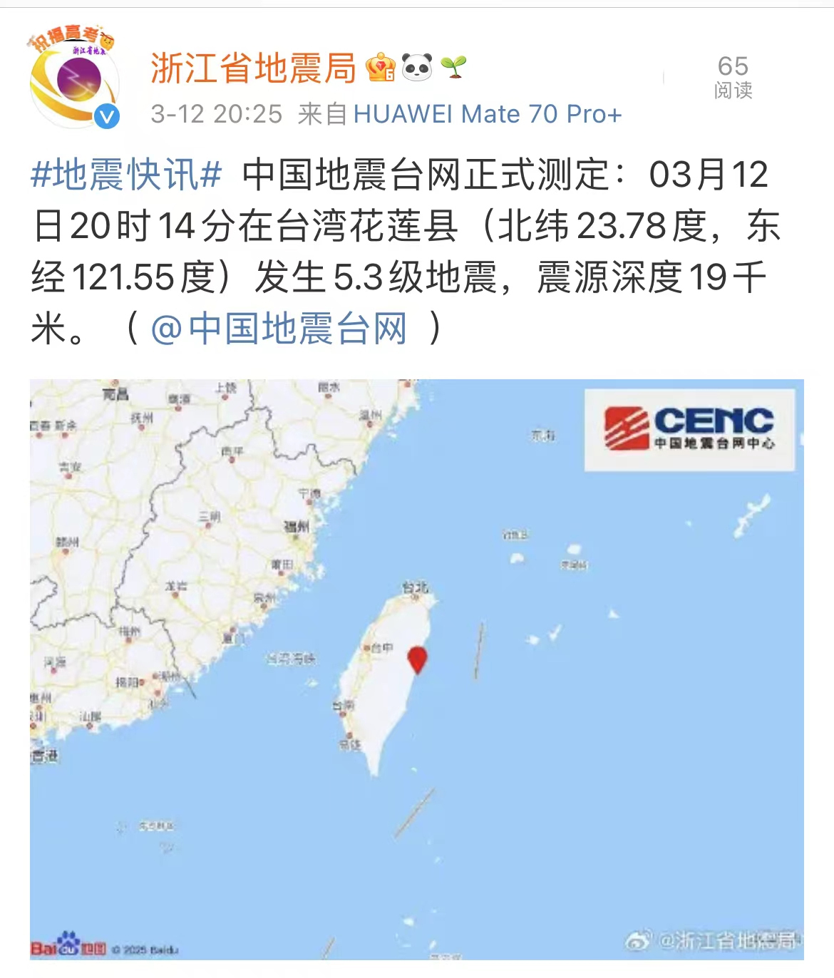 中国地震台网正式测定:03月12日20时14分在台湾花莲县(北纬23.78度,东经121.55度)发生5.3级地震,震源深度19千米。