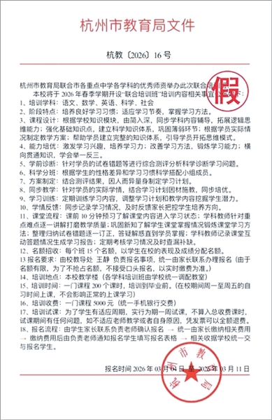 都市快报讯 近日,多名杭州家长反映:有一则文件以“杭州市教育局联合市各重点中学各学科的优秀师资举办此次联合培训”为由,通过短信、邮件等形式发送给家长和学生。要求将报名费5000元一门打入指定的账号。