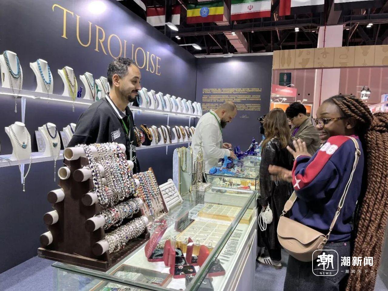 在“金砖国家进口专区”,涌金君遇到了埃及艺术家阿飞。“我在埃及有个艺术工作室,这是我第一次来中国,目标是把我的艺术品牌推广到中国,我的合作伙伴告诉我,浙江有着具备审美和购买力的消费者,还有各种销售平台,所以我来寻求机会,希望后面几天能为我的珠宝找到合适的销售渠道。”