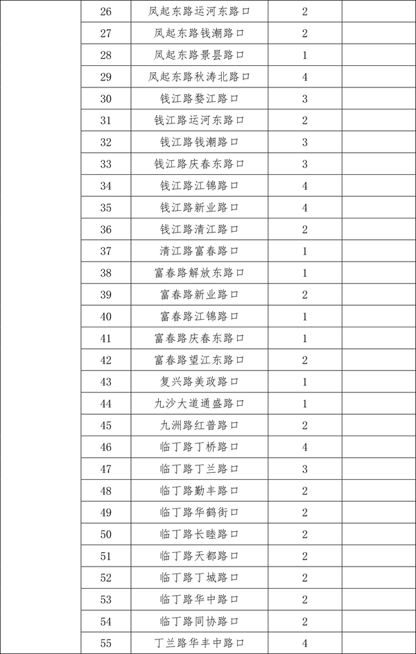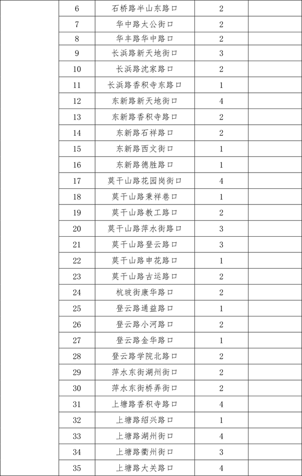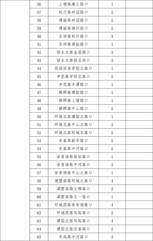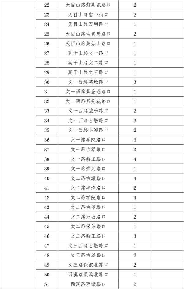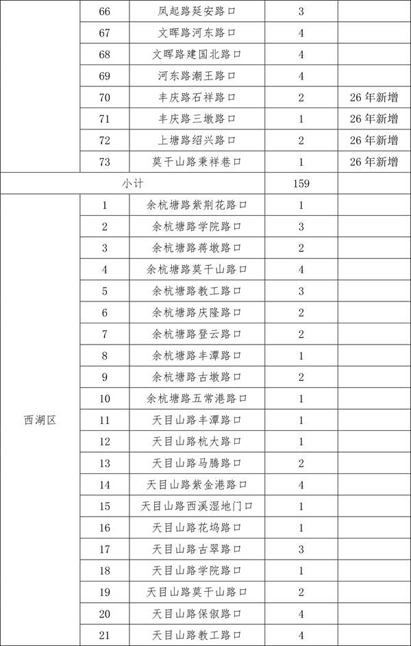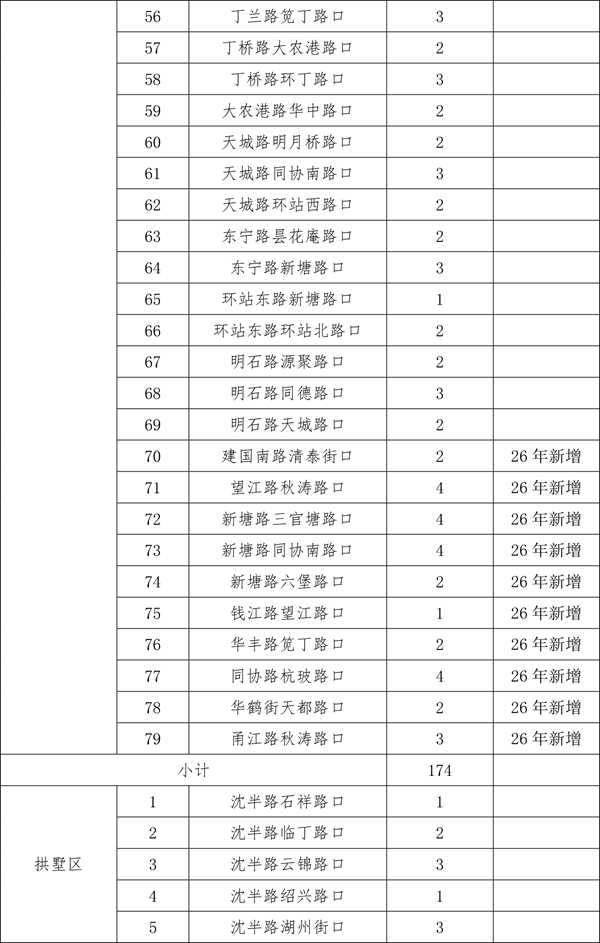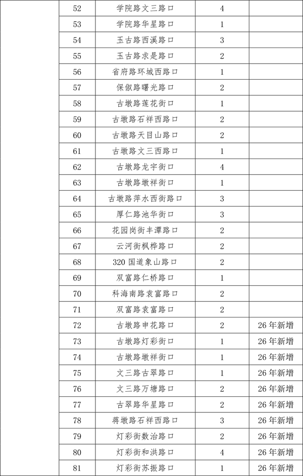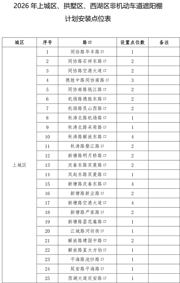 由于2025年安装的470个遮阳棚中,部分点位存在树荫遮挡等情况,经排摸,计划取消其中的26个。另有今年新增(调整)的点位共计56个。现将500个确认安装的点位进行公示,在此基础上,如市民朋友还有设置需求和意见建议,可于3月30日前发送电子邮件至hz85175529@163.com。点位设置要满足路口无树木遮荫、非机动车通行量较大、通行宽度大于3米、不影响地下管线和智慧交通探头、机非道路有隔离带、无道路施工、地铁建设等前置条件。