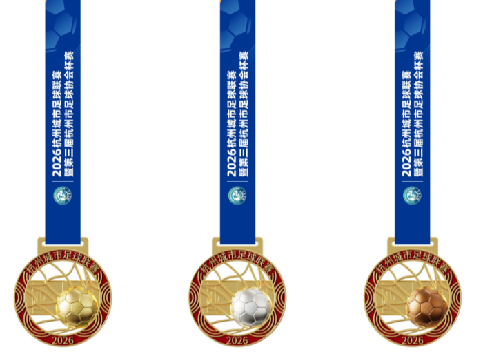 金银铜奖牌同样别具匠心。以足球破门瞬间为设计原点,奖牌边缘的涟漪纹理取自西湖水波,为赛场的拼搏瞬间注入一抹江南温柔。金、银、铜三色对应冠、亚、季军,每一枚都将悬挂于胜者胸前,承载汗水与荣光。