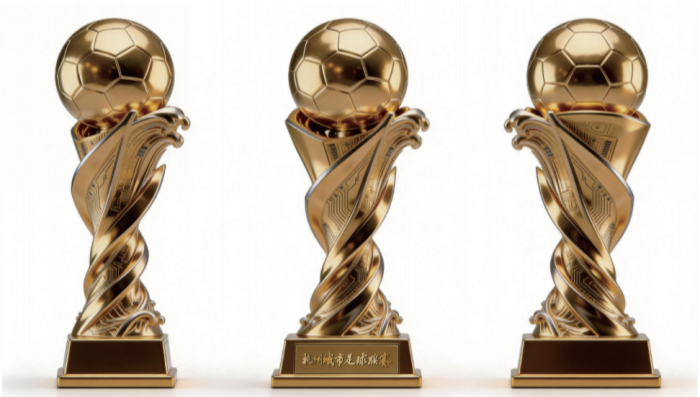 伴随热度一同升温的,还有象征荣耀的全新奖杯与奖牌。这份为决赛量身打造的绿茵信物,来自杭州本土的“钛杯专家”特美刻,不仅工艺上展示了精益求精的技术实力,更将杭州的城市气质融入其中,让足球的激情与江南的诗意交汇。本届冠军奖杯高75厘米,以金色为底,造型灵感源自宋代官窑旋纹瓶。瓶身流畅的旋纹如钱塘江水奔涌向上,托起顶端的足球,定格下属于冠军的荣耀瞬间。杯座“杭州城市足球联赛”字样,由西泠印社社员沈颖丽亲笔题写,经工艺复刻后更显金石风骨。底座预留钛片,将永久镌刻历届冠军队名,让荣耀随赛事传承,成为杭州足球不断书写的历史注脚。