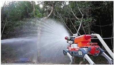活动中,人机协同防灭火实战演练尽显科技硬核实力,成为最大亮点。模拟火情触发后,“林火智治”平台迅速响应,依托云计算和人工智能技术精准调度:巡林四足机器人灵活穿梭于模拟火场,搭载双光谱云台实时传回温湿度、火情位置等数据,为指挥决策提供支撑;载重灭火无人机呼啸升空,精准投送灭火物资。演练通过“空天地人机”一体化防控格局,全景展现了杭州“人防+技防+智防”现代化防灭火体系的建设成效。