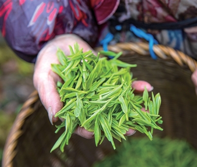 昨天上午,双峰村茶农在采摘西湖龙井。 记者 陈中秋 摄