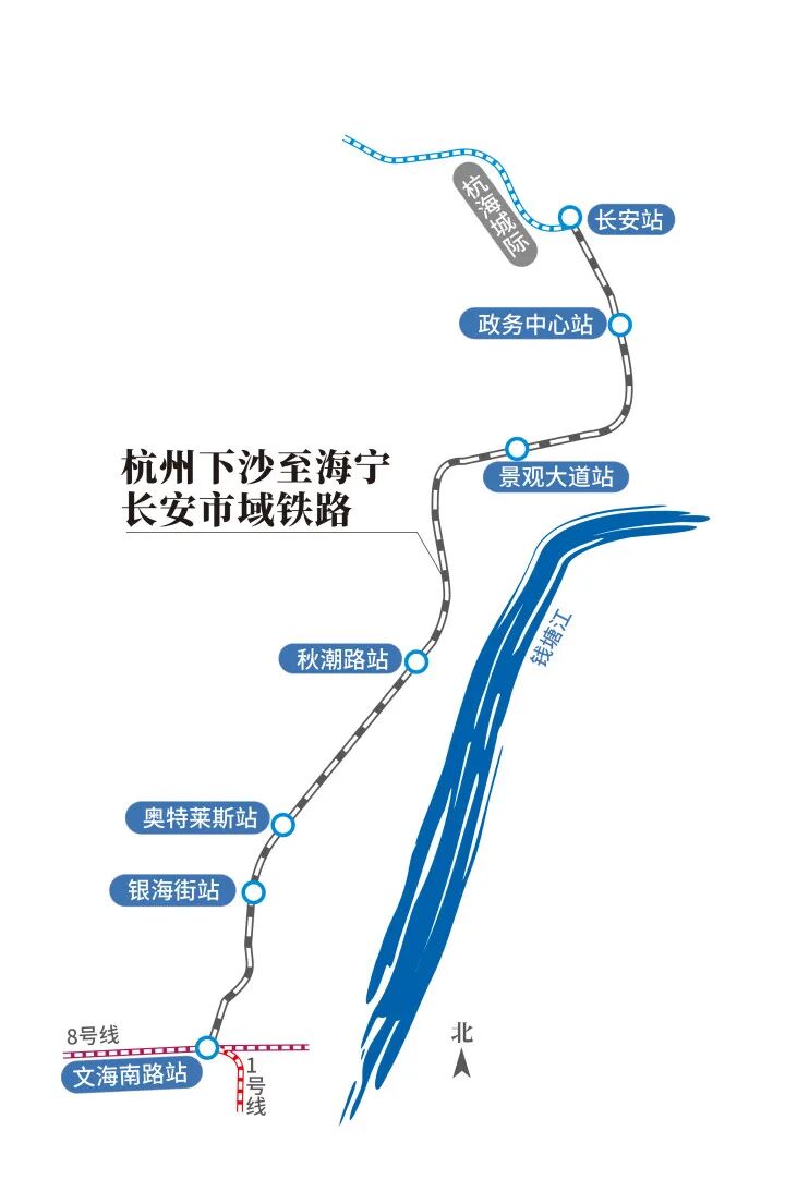 线路始于杭州钱塘区文海南路站,可直接与杭州地铁1号线、8号线无缝衔接,向北串联多个核心区域后,止于海宁杭海城际长安站,实现与杭海城际跨线运营。