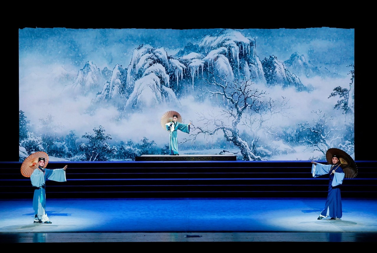 甬剧、姚剧、新昌调腔等地方剧种一起同台演出《珍珠塔·跌雪》,三个男小生扮演“方卿”。供图:浙江京昆艺术中心