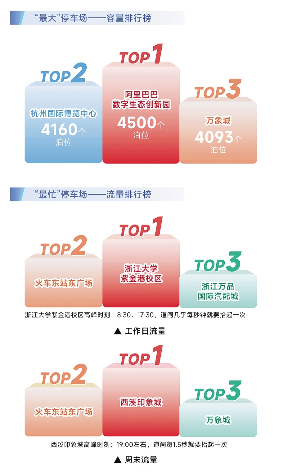 工作日“顶流”:浙江大学紫金港校区,单日进出车次超2万次,早晚高峰精准锁定8时30分和17时30分,通勤、上下学车流交汇,堪称杭城工作日“活力标杆”。火车东站东广场、浙江万品国际汽配城紧随其后,单日进出车次也突破2万次,是通勤出行的核心停车节点。