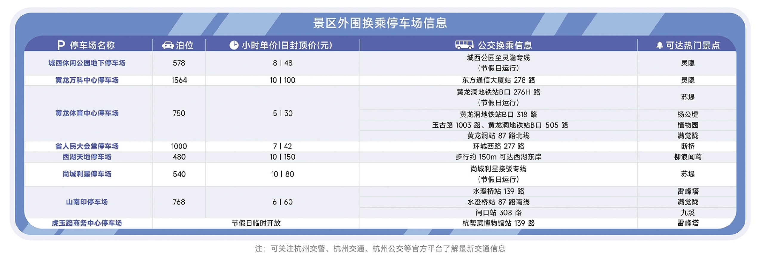 便捷之选:城西休闲公园地下停车场(578个泊位),8元/小时、日封顶48元,节假日有直达灵隐的专线;省人民大会堂停车场(1000个泊位),7元/小时、日封顶42元,换乘277路直达断桥。