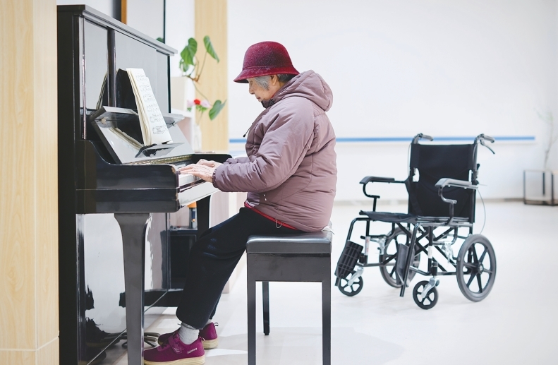 95岁的王奶奶戴着呢子帽坐在钢琴前,缓缓弹起《东方红》。“我年轻时在武林门还组织过200人的广场舞。”她曾参加过抗美援朝,战争结束后在杭州从事财务工作,直到70岁才退休。