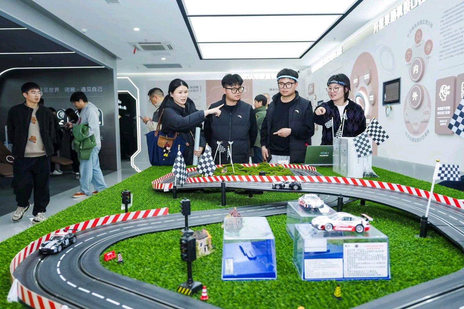 你见过用注意力比拼的赛车竞赛吗?在展厅的一头,一款由开星果脑机接口,为孤独症患儿设计的可穿戴智能脑机接口。通过非侵入式脑机接口,实时捕捉额头细微脑电、肌电与神经信号,来训练社交、沟通、发音、语言、行为规范等。