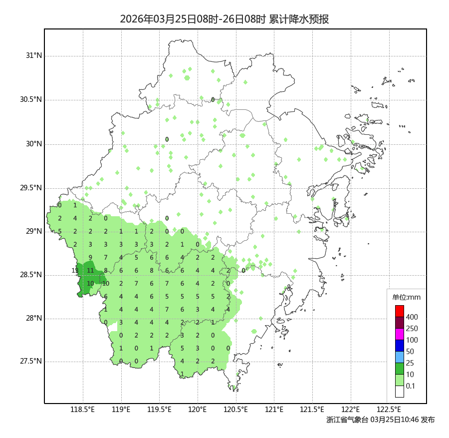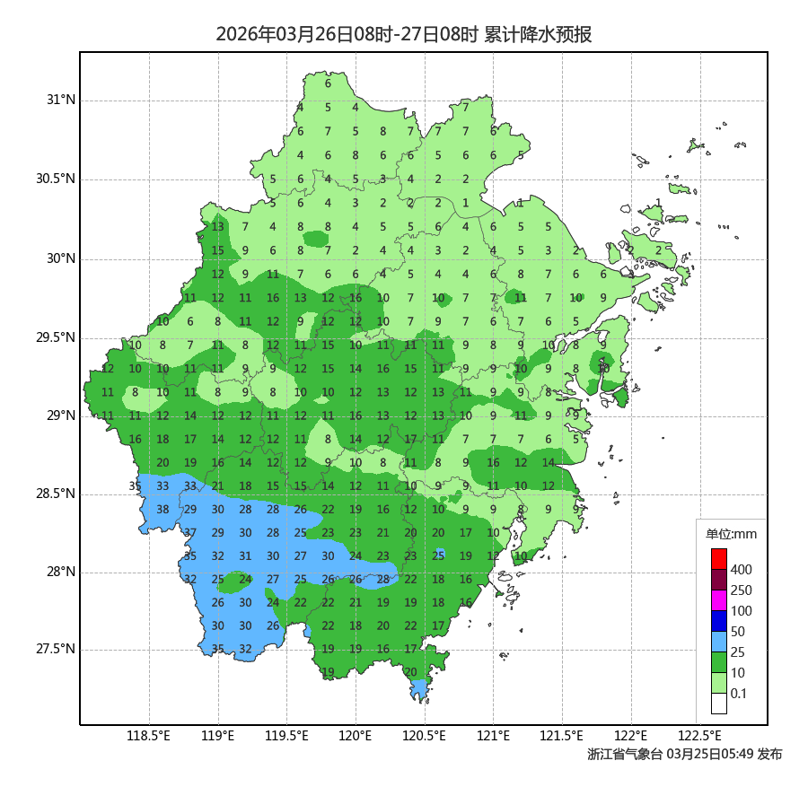 第一轮降水:雨水重来,今天夜里浙西南地区先锋部队率先出现阵雨的身影,而主力军主要出现在明天,降水分布集中在浙中南地区。降水量级比23日-24日的弱一些,局部雷雨,部分中到大雨,局地可伴有短时暴雨。