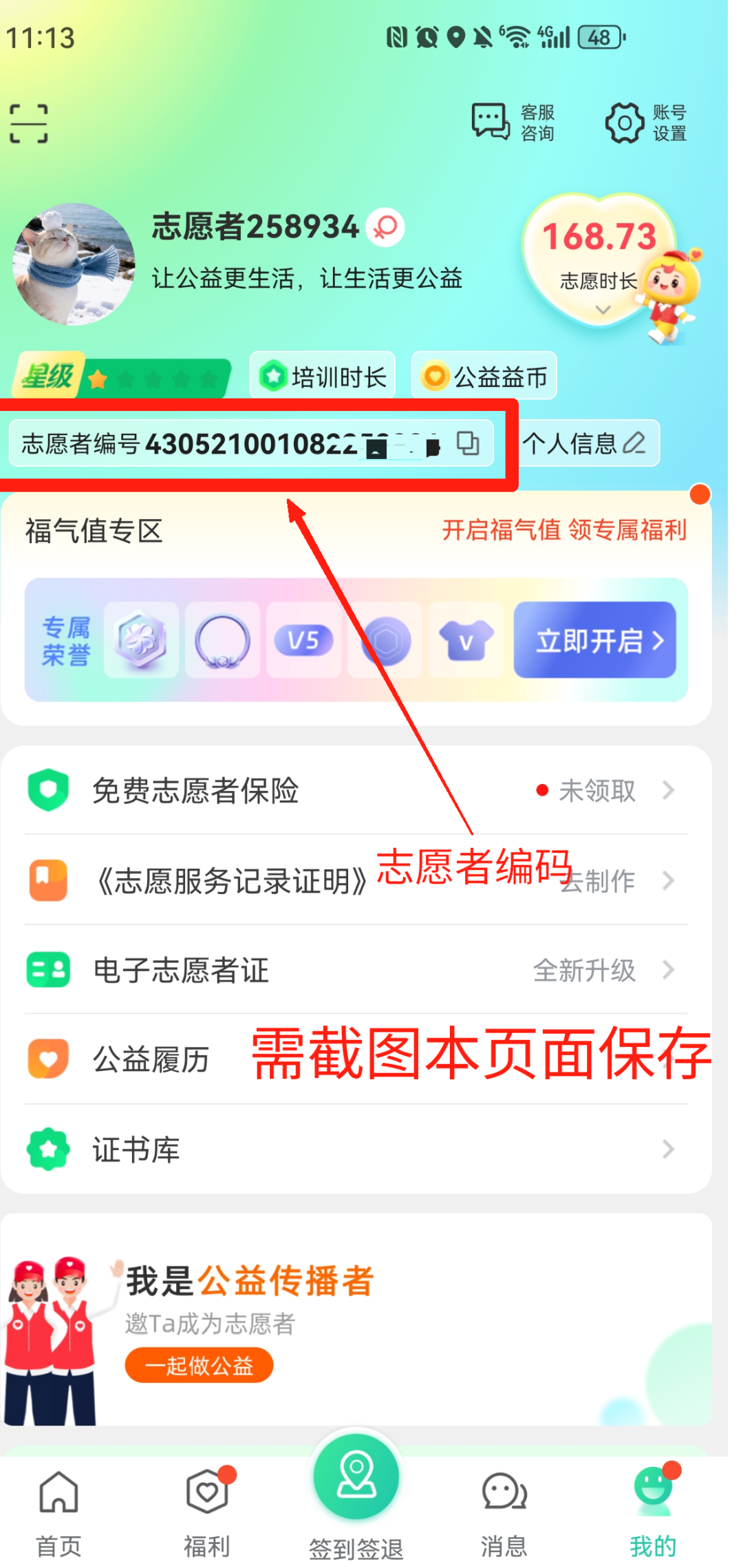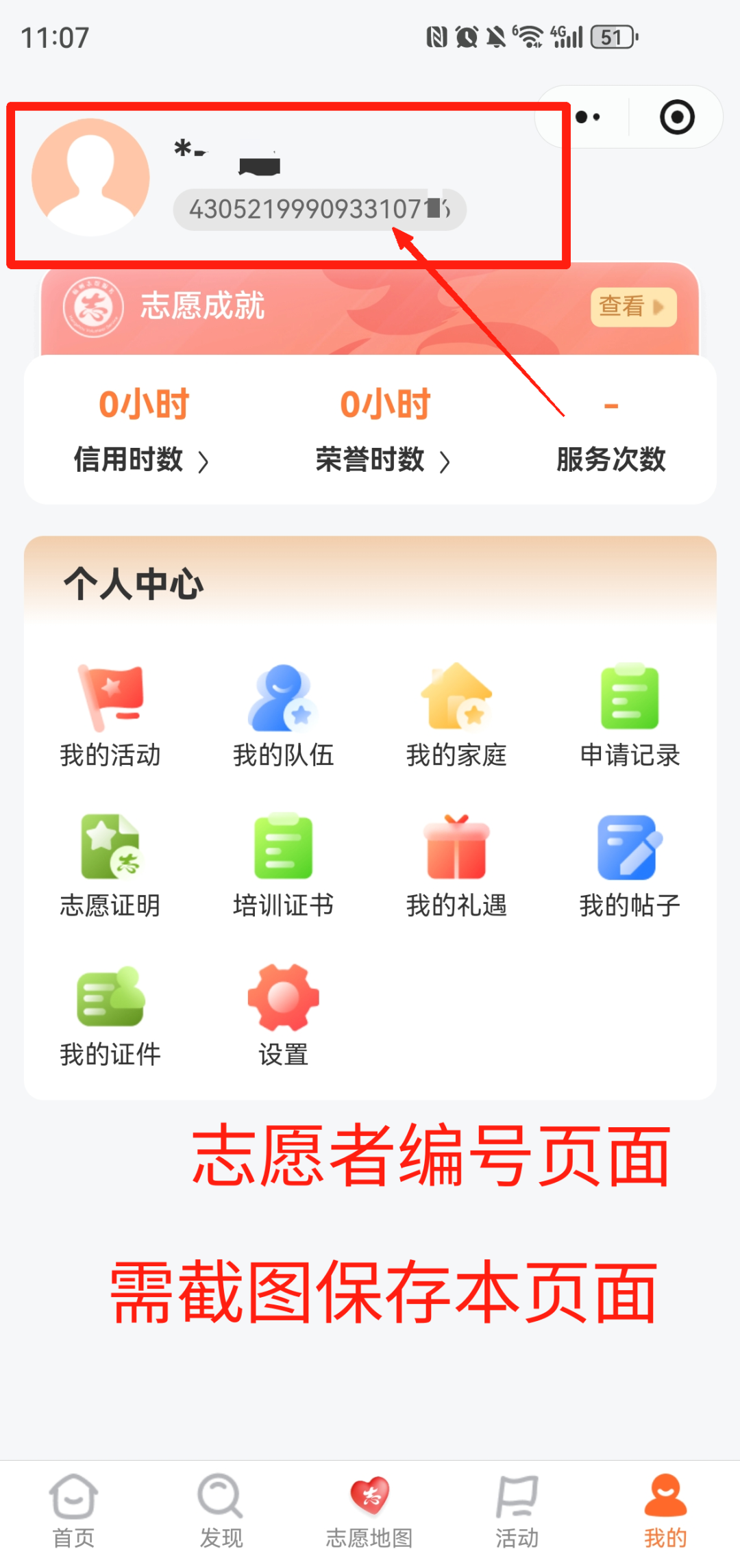 ①打开志愿汇APP,点击“我的”页面,截图保存含志愿者编号页面。