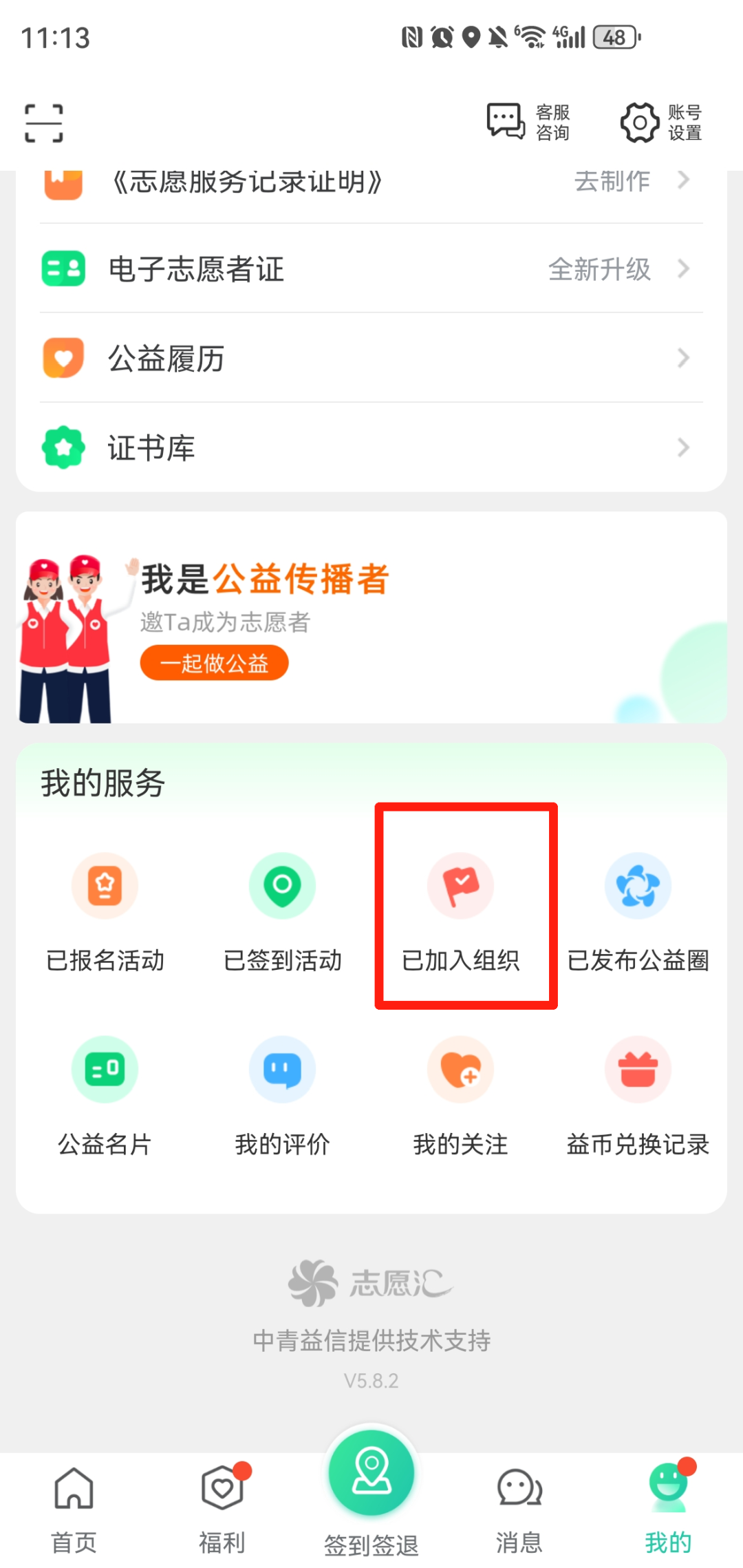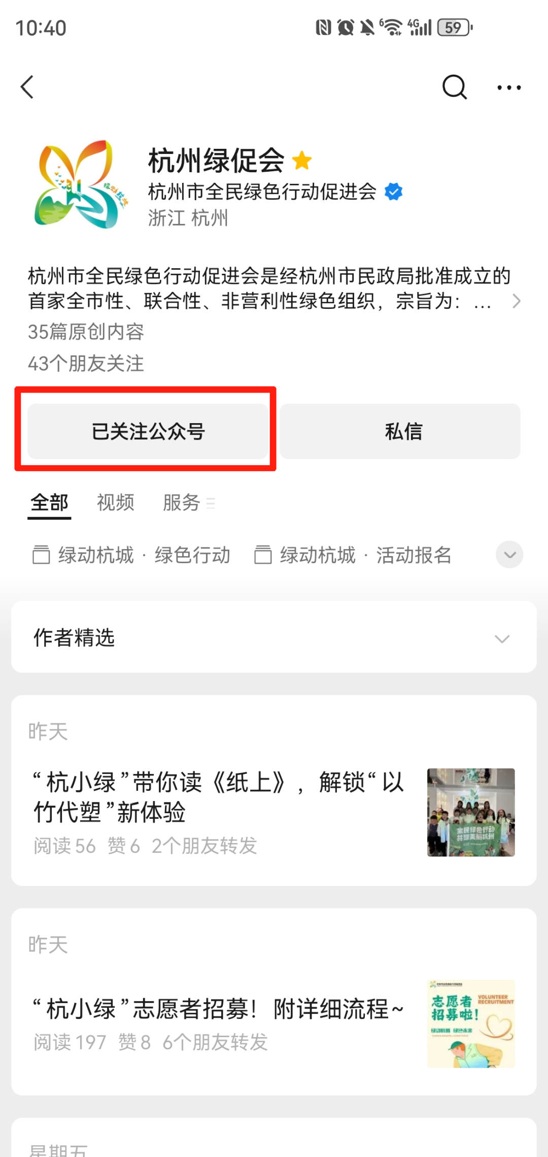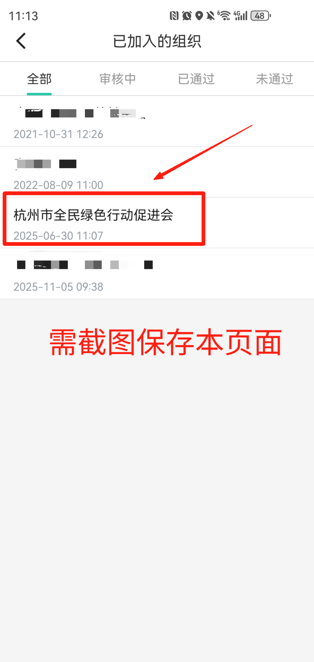 ②在“我的”页面下滑,选择已加入组织,截图保存含组织“杭州市全民绿色行动促进会”页面。