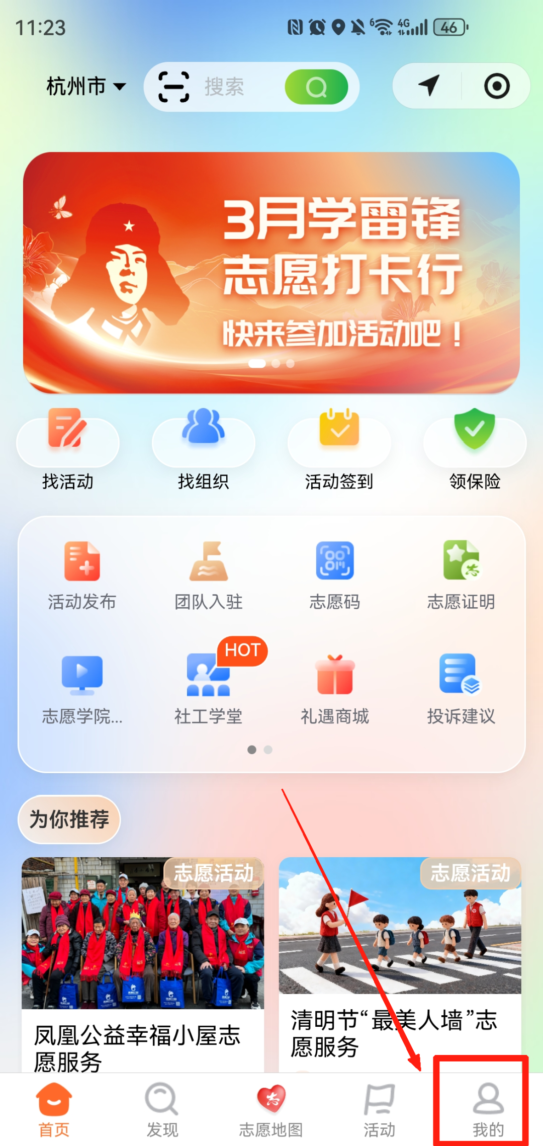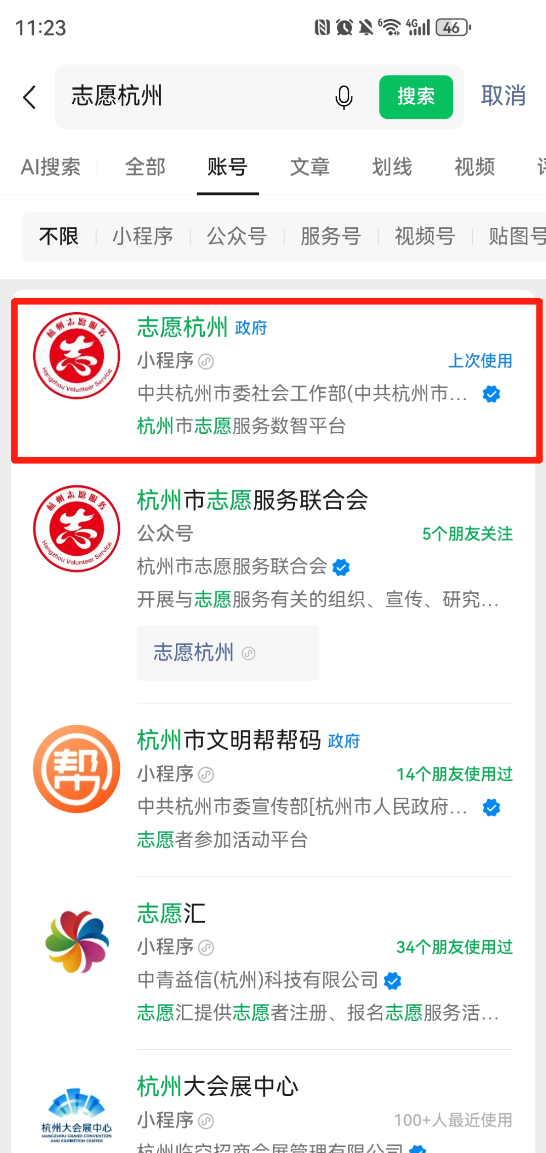 ①微信或支付宝搜索“志愿杭州”小程序。点击右下角“我的”。