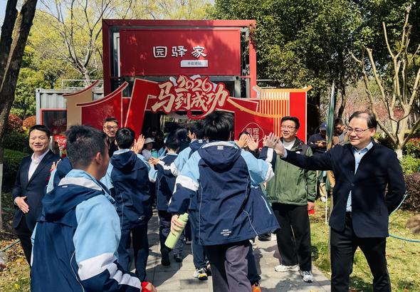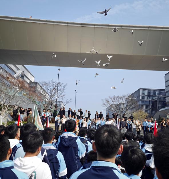 在数字之潮观景平台,活动迎来高潮。学生代表走上前,畅谈自己的梦想与备考心声,言语间满是对未来的憧憬与脚踏实地的坚定;教师代表温情寄语,叮嘱学子们珍惜时光、不负努力,以从容之态奔赴远方;校领导为全体初三学子加油助威,鼓励大家以此次毅行为契机,把徒步中磨砺的坚韧意志,转化为人生路上的不竭动力,不负青春、不负韶华,奋力奔赴属于自己的“丰收”。随后,师生共同放飞和平鸽,洁白的鸽子腾空而起,承载着全体师生与家长的美好祝愿,在春日的天空中画出最美的弧线,现场掌声雷动,氛围感满满。