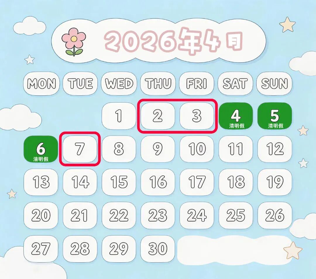 放假时间:4月2日-4月3日、4月7日,与清明假期(4月4日-4月6日)衔接,形成4月2日-4月7日6天连休。
