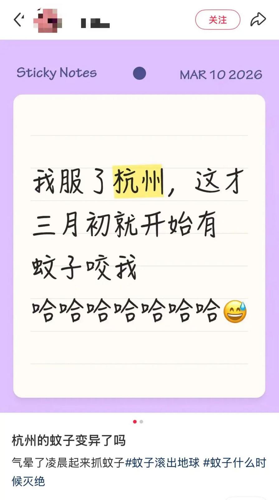 “我服了,杭州3月初就开始有蚊子咬我……”