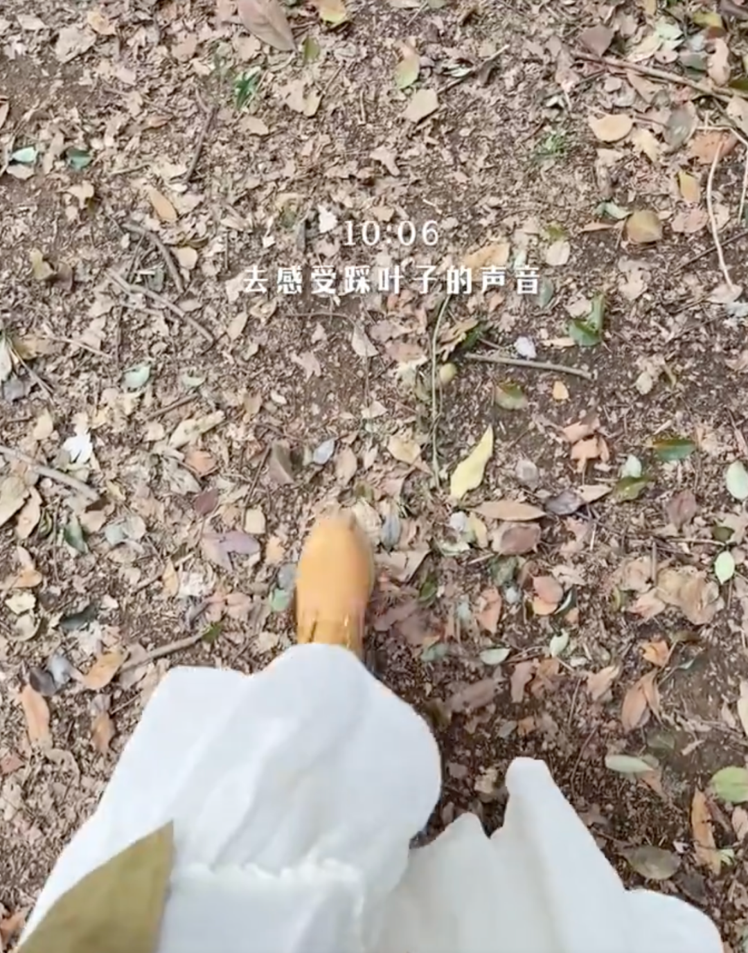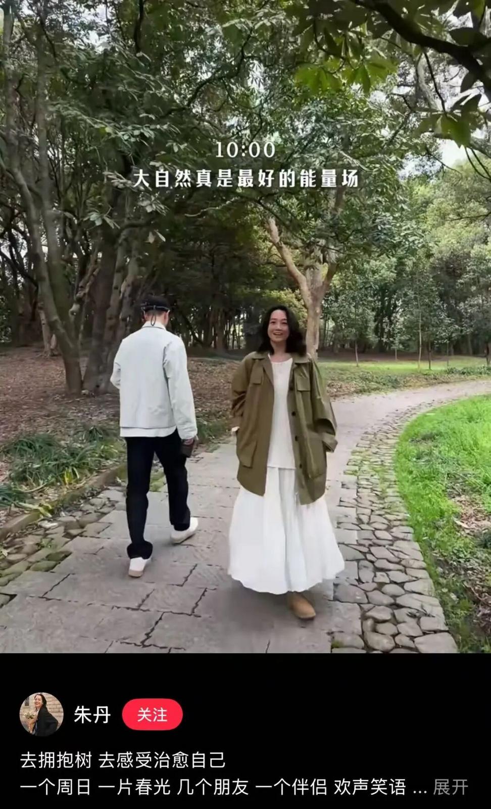 视频中,朱丹行走在植物园的林间小道,脚下的落叶被踩踏发出“沙沙”的声响,氛围感十足。