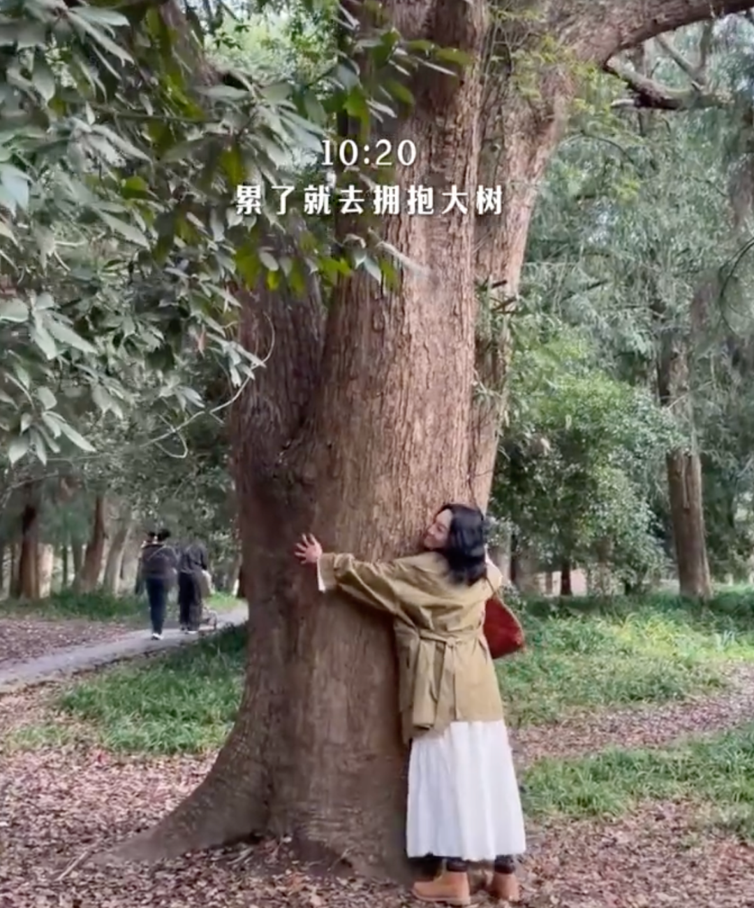 画面里,她走向一棵枝繁叶茂的大树,轻轻张开双臂拥抱树干,沉浸式感受自然带来的力量。