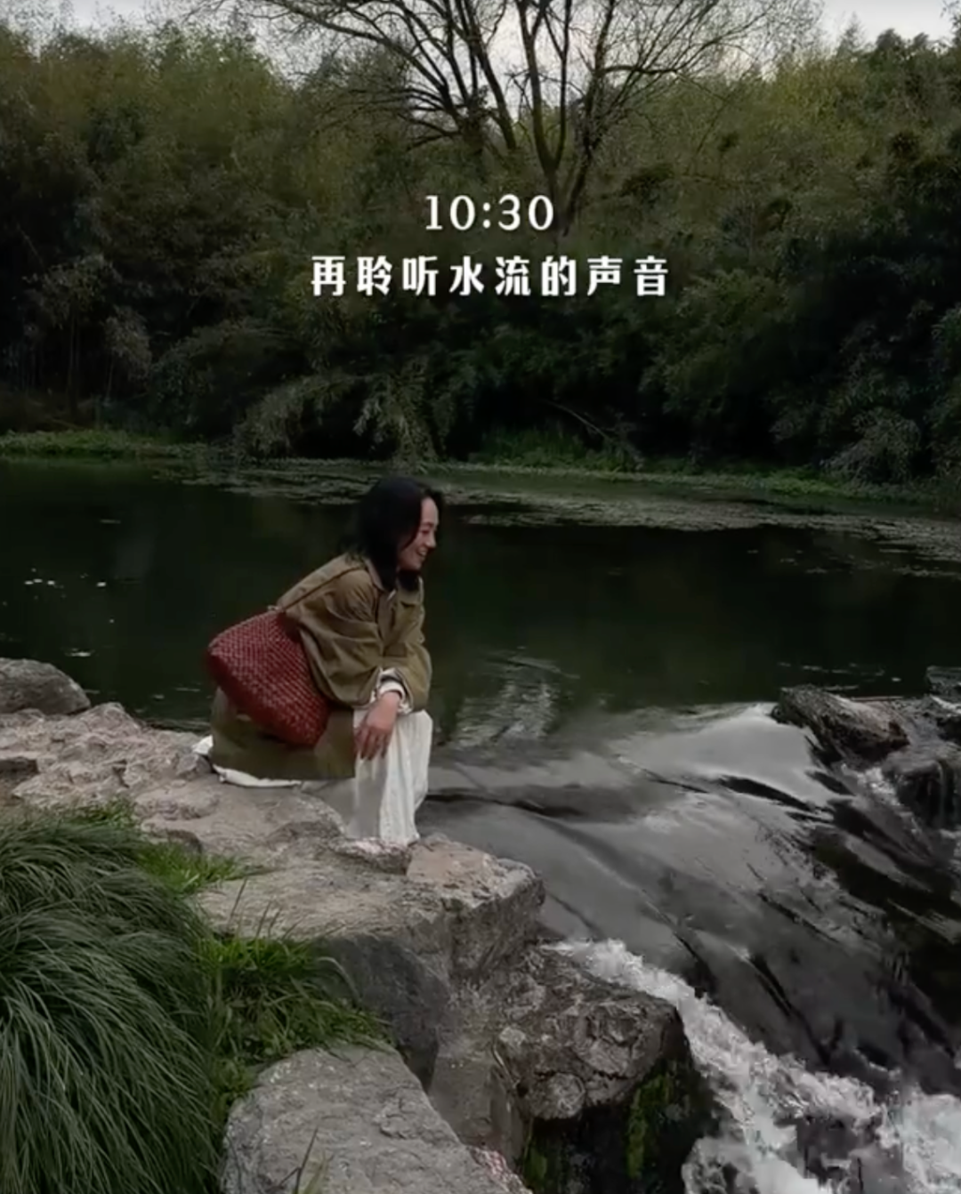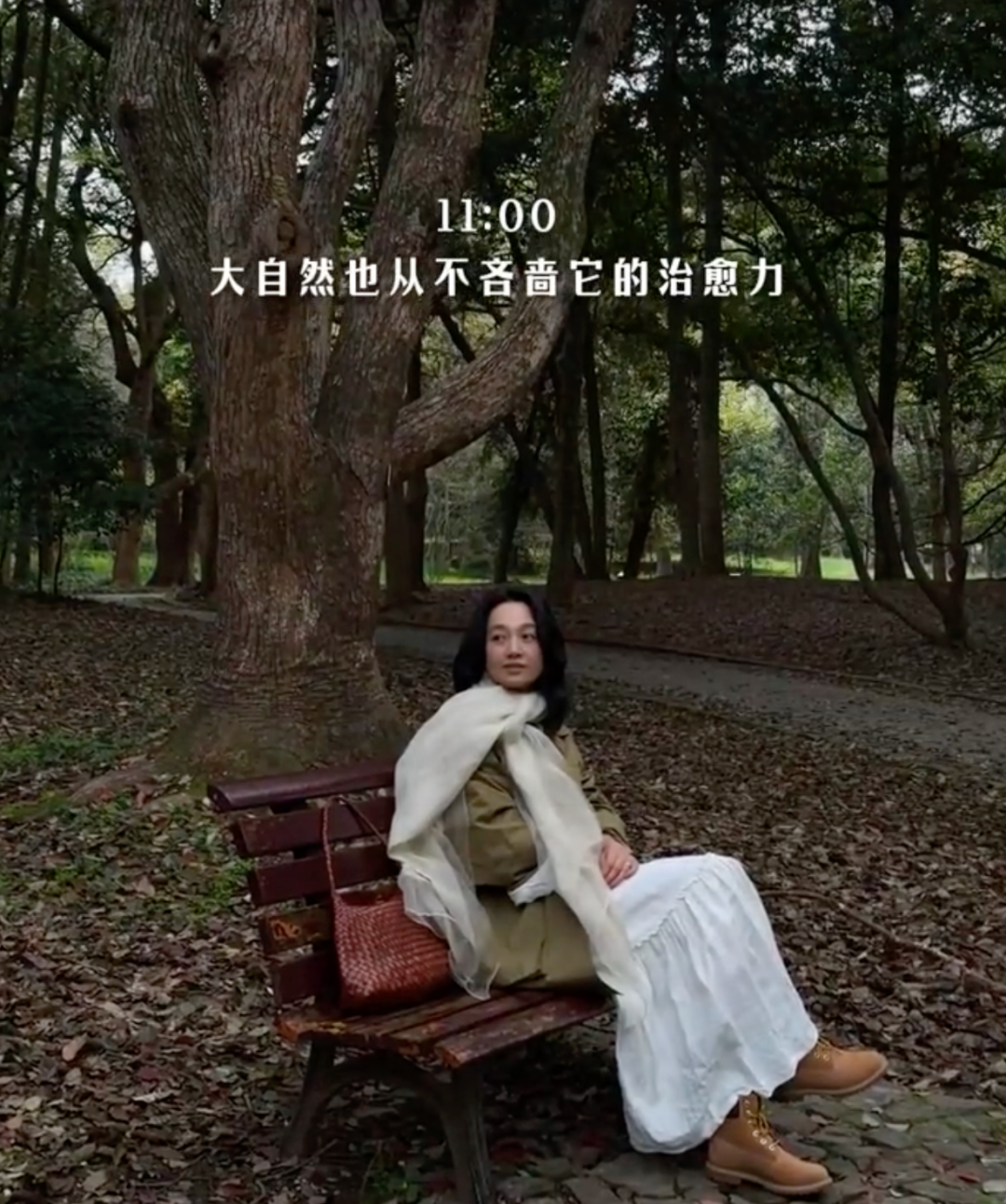 除了拥抱大树,视频中还记录了朱丹在植物园的日常:时而静立聆听水流声,感受草木生长的生命力;时而俯身观察花草,感受春日的生机;时而找一处安静角落静坐放空,享受片刻的松弛。