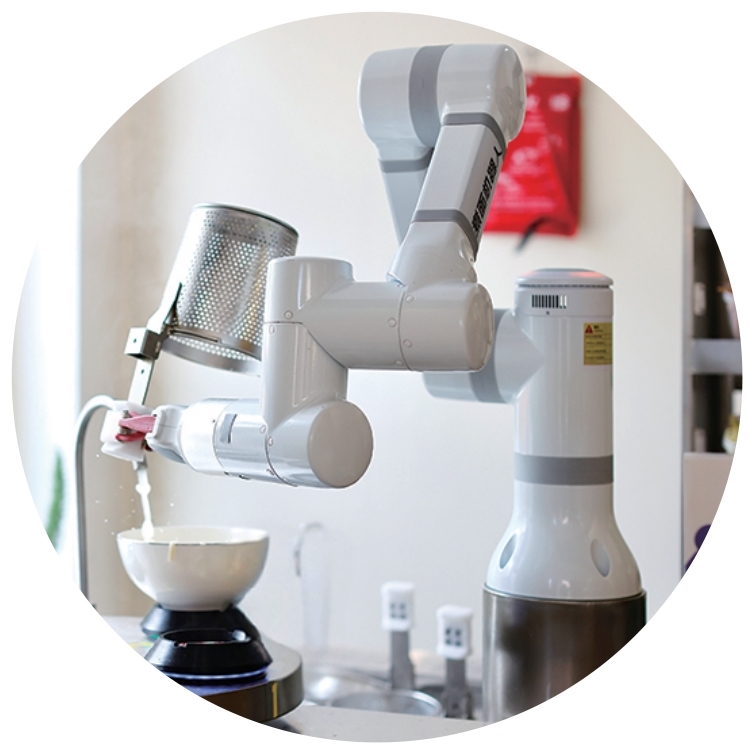 烹饪机器人能做出100多种家常菜,从三杯鸡到蟹黄豆腐都不在话下。参与研发煮面和烹饪机器人的工程师朱祺说,机器人的动作精细模仿了杭帮菜大厨的手法,出锅的菜品实现了标准化。