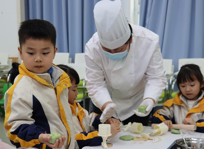 大学食堂师傅教幼儿园萌娃做青团悟劳动