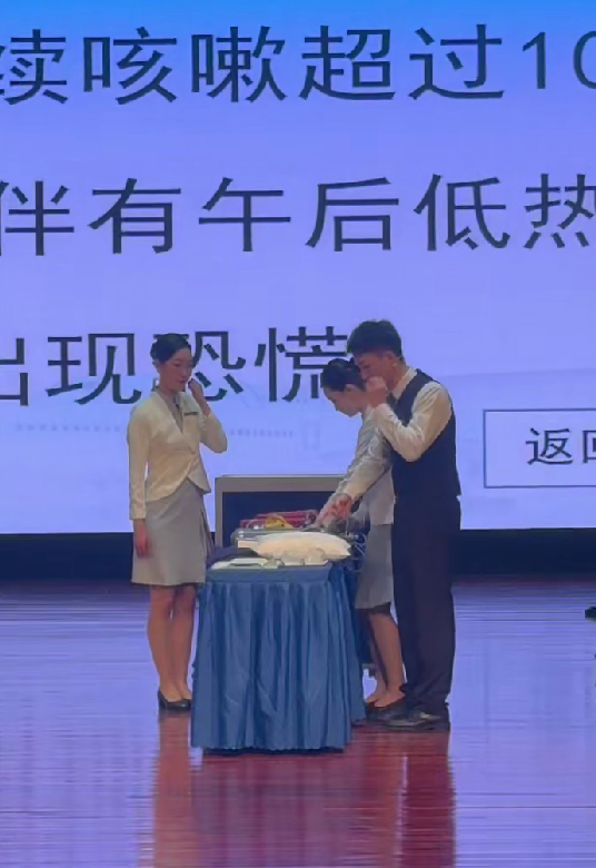 “旅客突然意识丧失,全身强直阵挛抽搐,口吐白沫,牙关紧闭”“长途飞行中,一名肥胖旅客睡醒时发现左小腿肿胀、疼痛、发热、皮肤发红”“乘务员发现一名旅客持续咳嗽超过10分钟,咳出黄绿色浓痰,且伴有午后发烧,周围旅客出现恐慌”……题目里限定了场景,怎么做就很考验选手的综合能力。