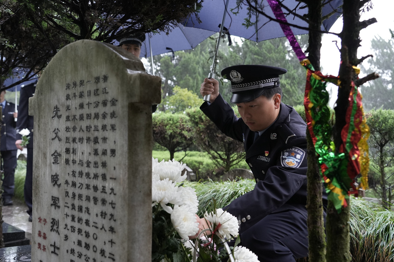 3月31日,在杭州革命烈士陵园,杭州市公安局西湖区分局40余名青年民警代表等依次在金晓军烈士墓前献上白菊。杭州市公安局供图
