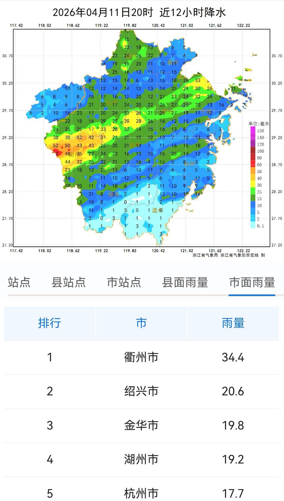 昨天(4月11日)白天,雨区逐渐从浙南朝北转移,下午起降水范围就牢牢锁定浙中和浙北一带。衢州中南部、金华西部、绍兴南部、宁波中南部、杭州南部、丽水北部和台州北部等地部分暴雨,个别大暴雨。