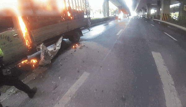 事情发生在4月1日下午2点多,杭州公安交管上城大队笕桥中队视频员在巡查时突然发现,在石桥路顾家畈路交叉口,一辆满载货物的小货车正燃起明火,浓烟腾起。