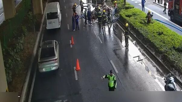 在水流的持续压制下,火势渐渐被控制下来。不久后,消防人员赶到现场,对货车进行进一步打湿冷却,彻底杜绝复燃的可能。