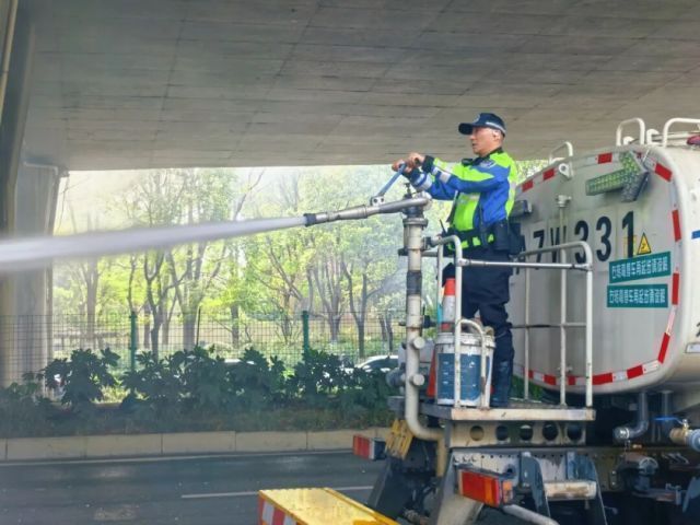 灭火行动很快开始。洒水车驾驶员驶上前,将车停在起火货车正前方,丁毅爬上洒水车,站在后方拿起水枪,对准火源位置一顿喷射。