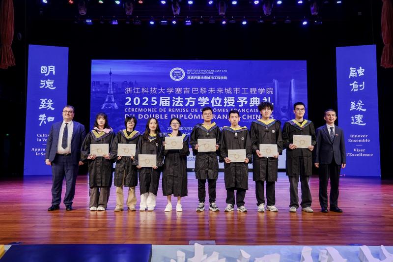 浙江科技大学校长陈建孟、法国塞吉巴黎大学校长洛朗·加蒂诺向本届毕业生表示祝贺。陈建孟表示,作为塞吉巴黎未来城市工程学院实体化运行后的首届毕业生,大家展现出的创新精神、务实作风和对多元文化的包容理解,正是中法产教融合最生动的体现。陈建孟希望同学们带着中法两国文化的滋养与母校的牵挂,以青春之我、奋斗之我勇敢走向世界舞台,在构建人类命运共同体的征程中,书写属于当代青年的精彩华章。