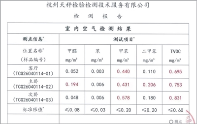 室一个点,第二天杭州允峰上门做检测。4月3日,杭州允峰的‘室内空气质量’检测报告显示,卧室甲醛(mg/m^[3])为0.184,是国家标准限值(≤0.08)的2.3倍,TVOC为0.712,超出国家标准限值(≤0.60)。检测公司的人私下告诉我,这样的房子,在自然通风环境下至少一年内都无法入住。”