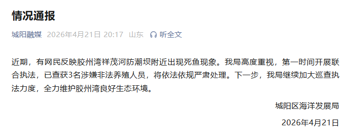 官方通报青岛一海湾现大量死鱼:3人涉嫌非法养殖被查