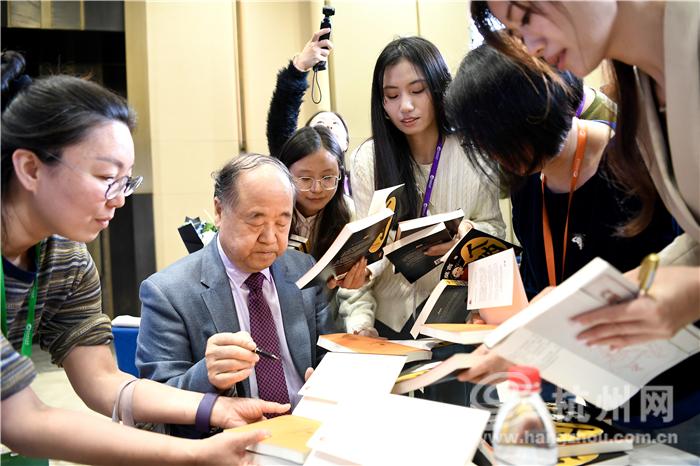 今天是“世界读书日”,杭州提前很久就邀请了莫言来杭。“我的老家今天也在举行读书大会,我说你们为什么不早约我。这个时候我老乡说杭州人办事真靠谱!”