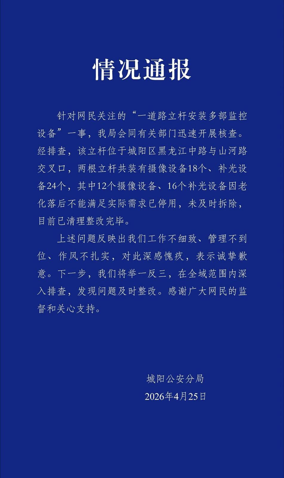 央视网消息:4月25日,青岛城阳公安分局发布情况通报。针对网民关注的“一道路立杆安装多部监控设备”一事,该局会同有关部门迅速开展核查。经排查,该立杆位于城阳区黑龙江中路与山河路交叉口,两根立杆共装有摄像设备18个、补光设备24个,其中12个摄像设备、16个补光设备因老化落后不能满足实际需求已停用,未及时拆除,目前已清理整改完毕。