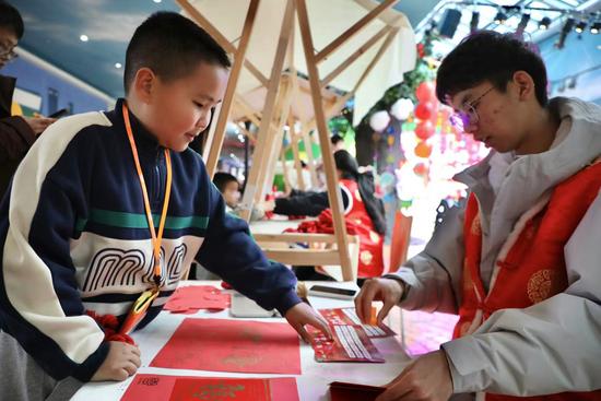 猜灯谜、集五福、舞龙狮、办年货……2月24日,“Do都城”少儿社会体验馆内张灯结彩、年味十足。